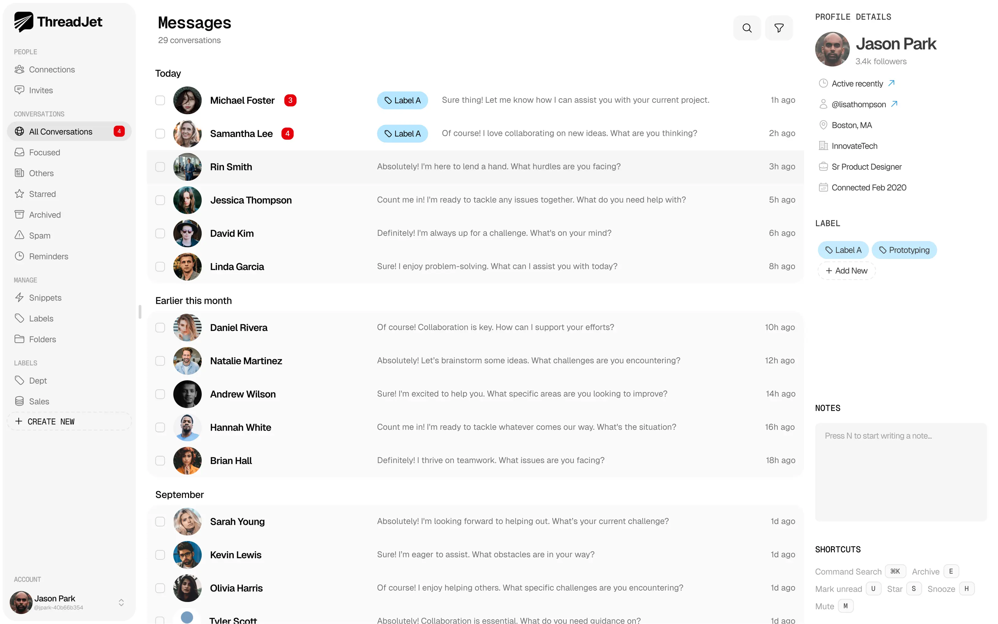 ThreadJet remembers context across conversations - it knows who’s who, what was said last, and what needs to happen next. Integrated notes, tags, and summaries keep you one step ahead. No more “Remind me who this is again?”